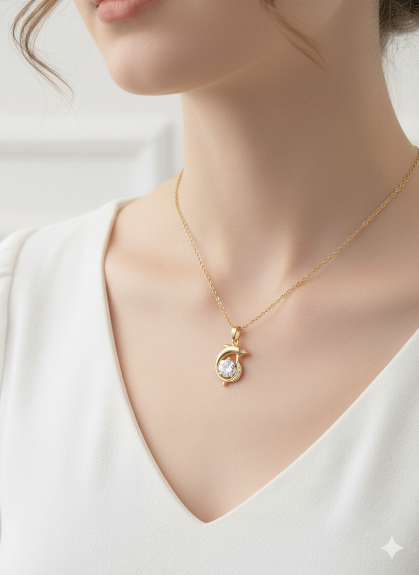 Graceful dolphin and crescent moon design crafted in gold-plated sterling silver. This pendant combines symbolic elegance with practical durability—the gold plating resists tarnishing and fading, maintaining its lustrous finish through daily wear. The long-lasting color ensures your jewelry retains its radiant appeal without frequent maintenance. Perfect for those seeking meaningful accessories that blend aesthetic beauty with reliable quality.