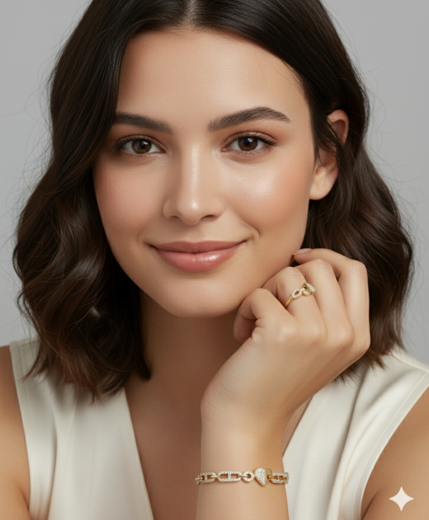 This Pave Heart Link Chain Bracelet and Ring Set features premium 18k gold plating with American diamonds that never fade. Anti-allergic and anti-tarnish construction ensures lasting brilliance and comfort, perfect for everyday elegance.